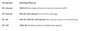 Split means that although the bird may not show a dominance to a specific breed, it carries that gene. For example a rainbow hen and a blue fronted lorikeet cock have a baby. The baby looks exactly like the rainbow hen mother however it would be considered split to blue front. A pied bird will display spots of an alternate colour for example a green indian ringneck hen and a violet indian ringneck cock produce young which are all green with violet spots of colour on their back and wings. The amount of mutant genes a bird receives for a certain trait is referred to as the single factor (SF) or double factor (DF). A DF bird has two mutated genes, which causes a noticeable visual difference, whereas an SF bird has one and exhibits partial markings. Hens can only be single factors in certain mutations, such as pastel, although cocks can be either single or double factors.